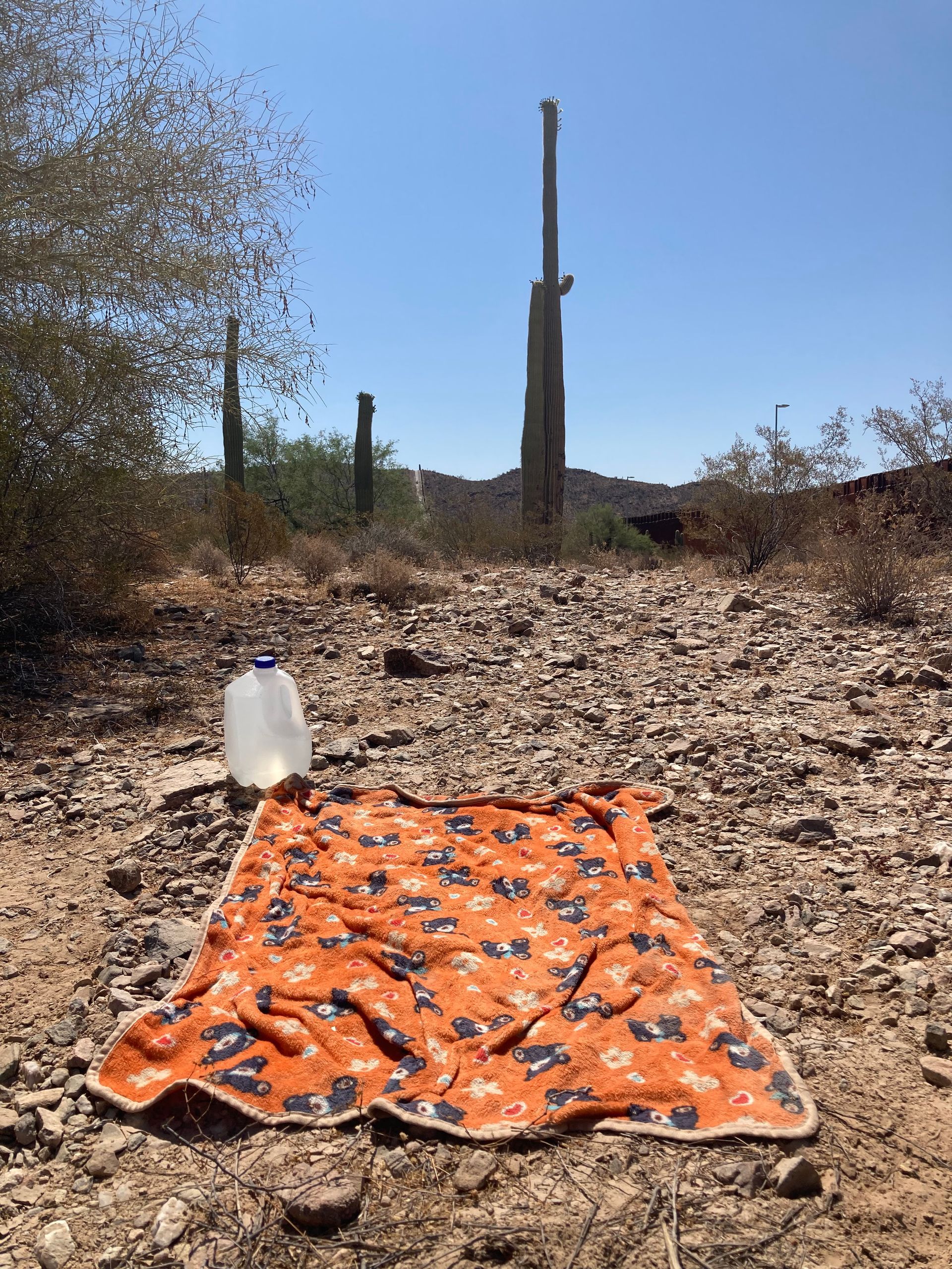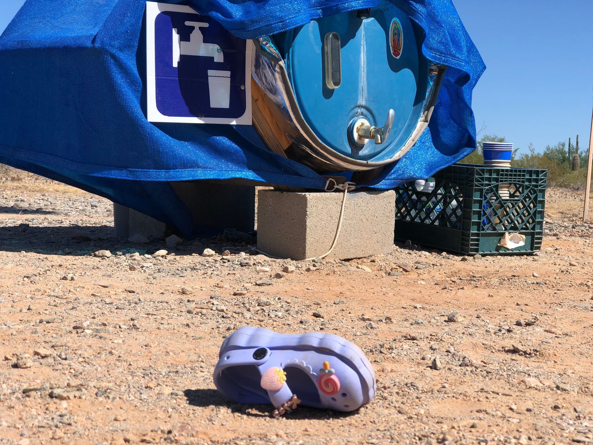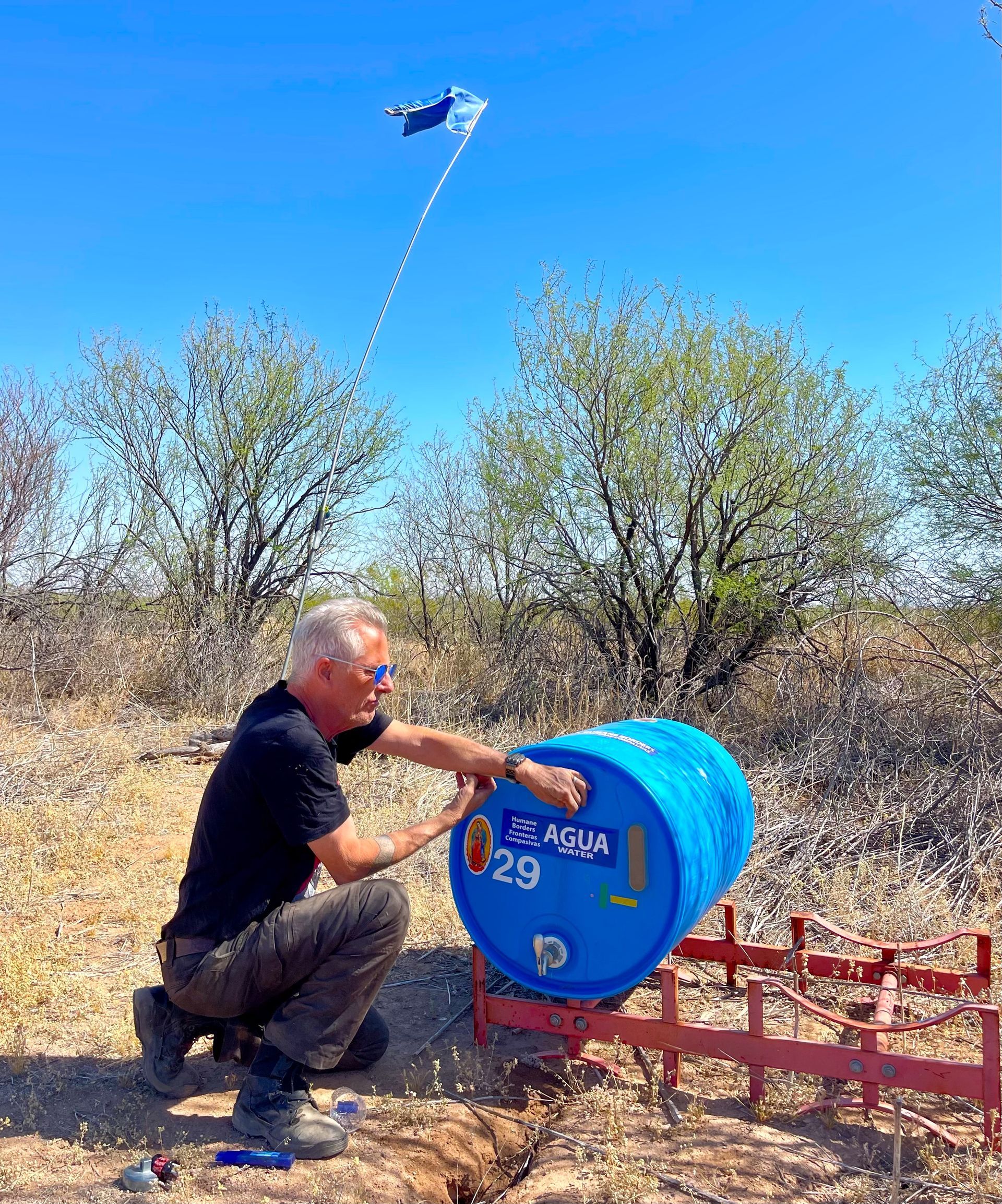 Humane Borders works with private and public land owners and managers to make water and other lifesaving resources available to migrants, families seeking asylum, and anyone who finds themselves in the unforgiving Arizona desert with no water. We even provide water for search and rescue groups and wildlife. Our water stations consist of 55-gallon blue barrels with a 30-foot blue flag that's visible for miles, with blue as the universal symbol for water.